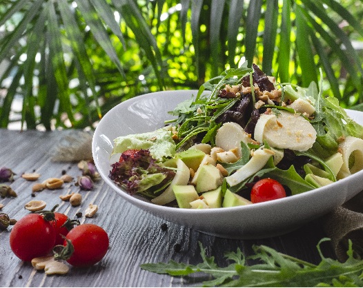 Ensalada fresca con rúcula, aguacate, palmito y tomate.