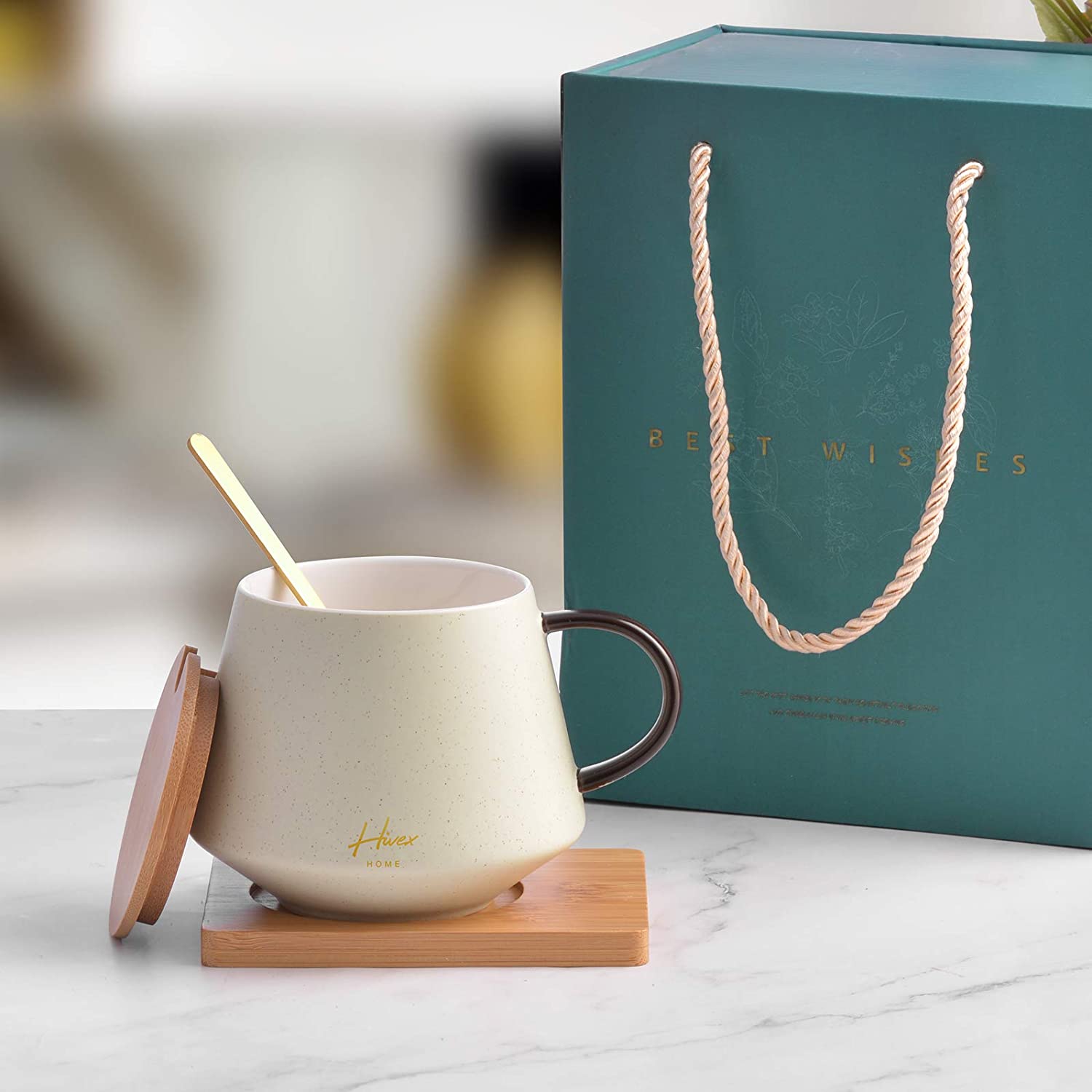 Hemos escogido esta taza de café como un regalo estupendo para cualquier ocasión, incluye una taza de cerámica con un diseño moderno, portavasos y tapa de madera y una pequeña cucharilla, en una elegante caja. Con capacidad de 13,5 oz, nos ha atrapado con su elegante diseño.
