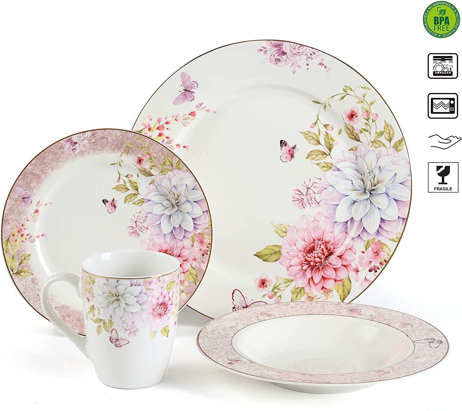 Uno de los más vello diseño de vajilla que podemos encontrar es este que nos lo trae la casa Kuty, apto para horno, lavavajillas microondas y congelador; pensado para 4 personas, su diseño está inspirado en la primavera, el nacer de las flores y las mariposas; el fabricante nos promete un reembolso o cambio por si llegase una pieza defectuosa; altamente recomendada.