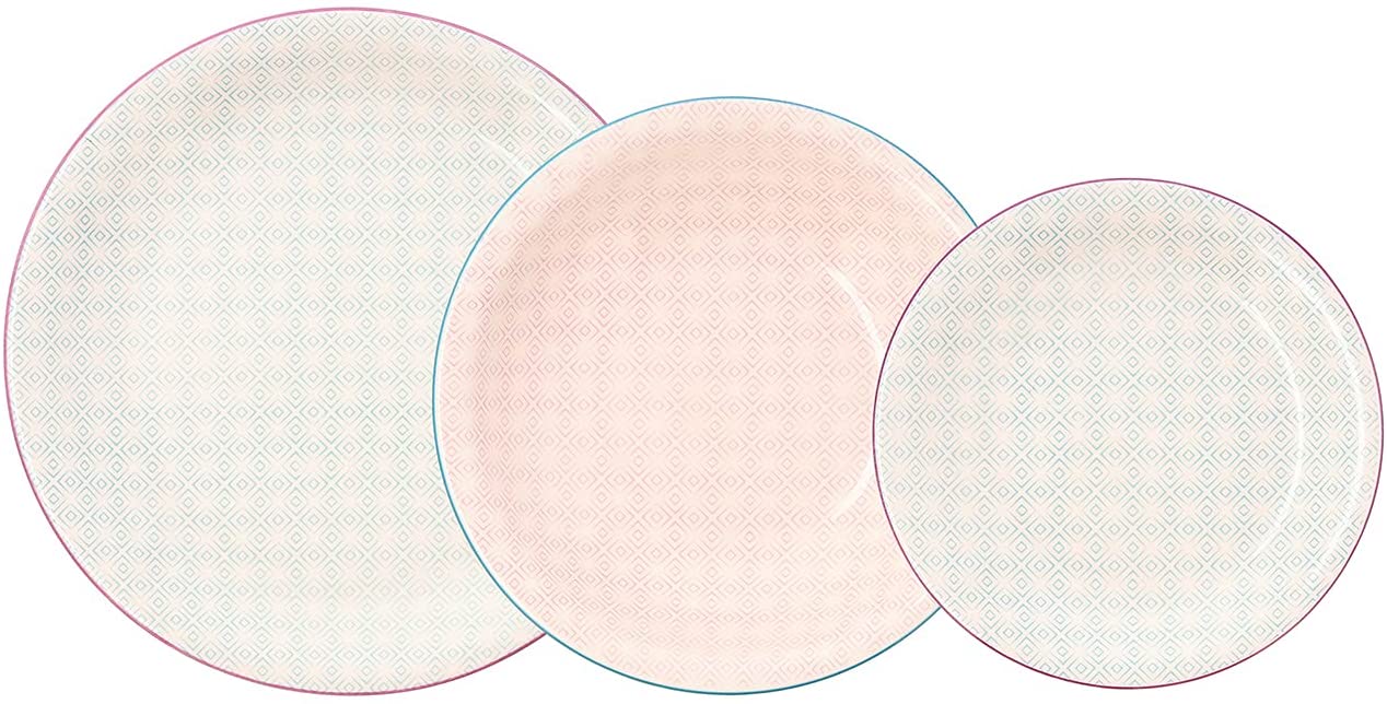 Si lo que buscas es un diseño delicado y dulce para el uso diario, este juego de vajilla va muy bien, está pensado para 6 personas, su diseño lleva figuras geométricas con colores pasteles muy suaves que harán juego en cualquier mesa. Contiene 6 platos llanos, 6 platos hondos y 6 platos de postre.